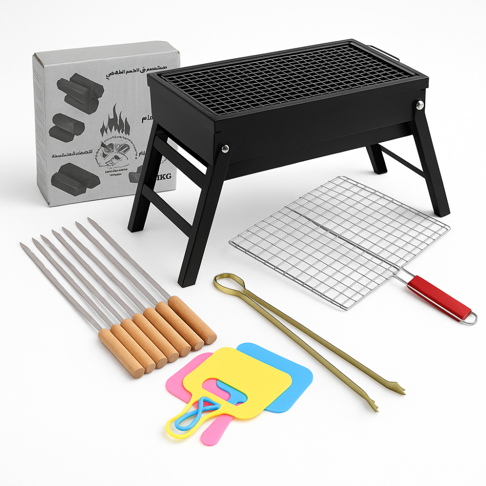 حزمة الشواء الصغيرة: كانون شواء صغير + 6 اسياخ + شبكة شواء صغيرة + ملقاط فحم شواء صغير + فحم شواء 5كجم + كشاشة بلاستيكية.